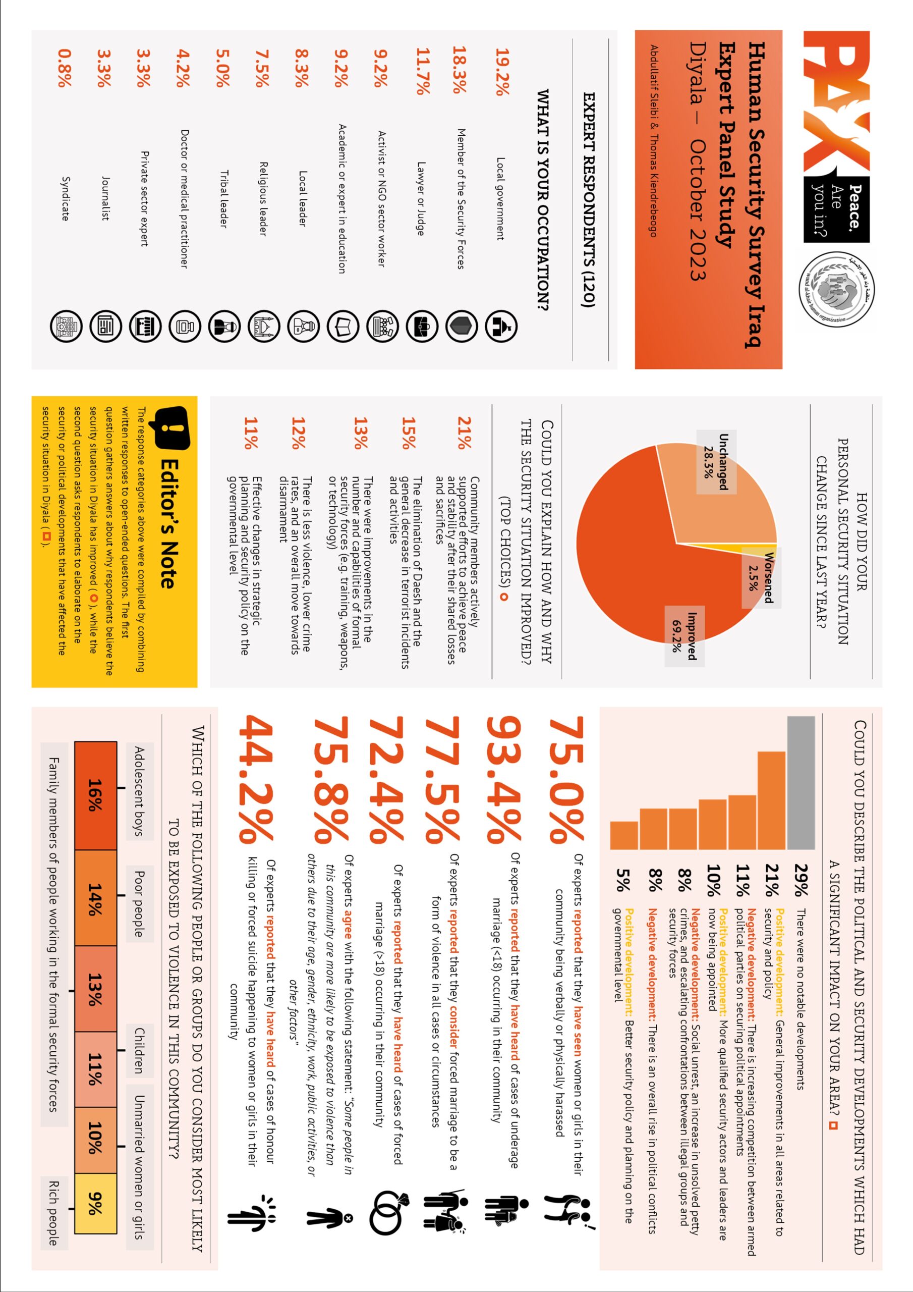 This report summarizes expert (e.g. academics, government officials, lawyers, tribal leaders) perceptions on various topics related to human security in Diyala, Iraq. Data was collected in Diyala by 4 enumerators from 15 October to 29 October, during which a total of 120 experts (12 females and 108 males) were interviewed. This was done in conjunction with our partner, Wand Al-khair Human Organisation.