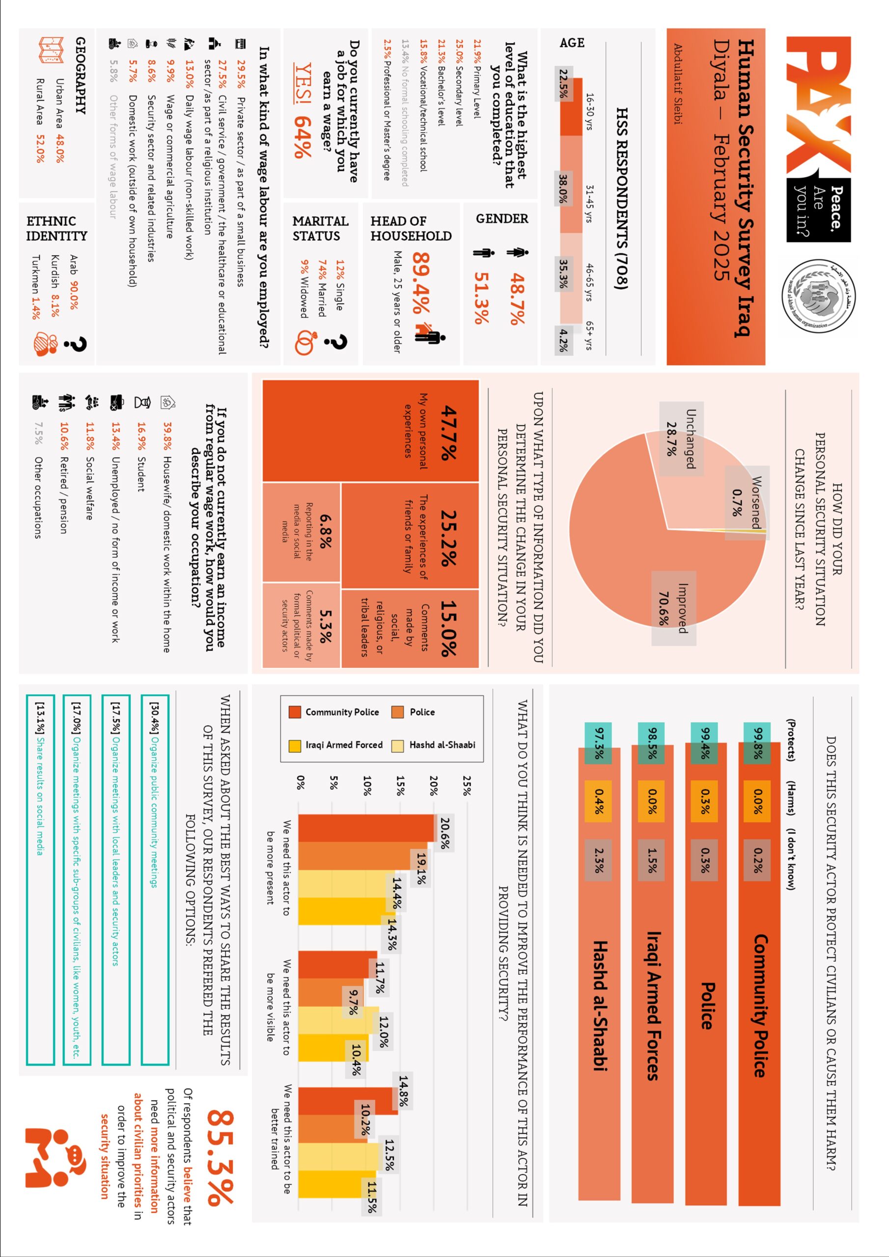 This report summarizes civilian perceptions on various topics related to human security in Diyala, Iraq. Data was collected in Diyala by 15 enumerators from 7 February to 22 February, during which a total of 708 civilians (345 females and 363 males) were interviewed. This was done in conjunction with our partner, Wand Al-khair Human Organisation.